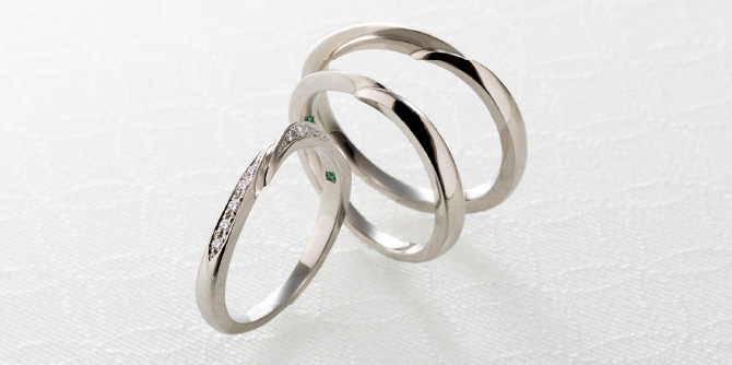 4月のはじめ頃、美しい新緑の葉を輝かせる二葉葵は春の息吹の象徴です。結婚指輪「葵」は厳しい冬の寒さを乗り越えて、地中から伸びゆく「茎」のあふれる生命力がモチーフ。有機的なアームラインで植物の持つ優美さとしなやかさを表現しています。内側には上賀茂神社神紋の二葉葵を刻印、刀鍛冶の流れをくむ職人による滑らかな着け心地がお二人の毎日に寄り添います。