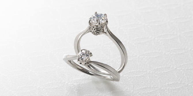石座には対となる二葉のモチーフをあしらい、横顔の美しさも楽しめる指輪にデザインしました。