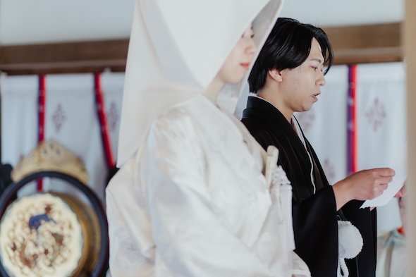 ご準備でこだわられたこととしては、新婦様のお名前に「桜」の文字が入っていることから、時期は境内の桜が綺麗に咲く春のご結婚式、桜の模様が入った白無垢をお選びになりました。