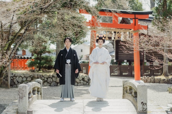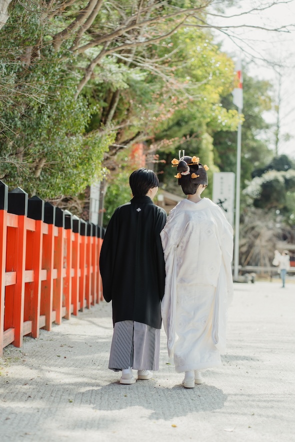 上賀茂神社をお選びいただいた理由として、新婦様が子どもの頃に上賀茂神社での結婚式に参列されたことがあり、その厳かな雰囲気が印象的で「将来はここで式をしたい」と考えておられたそうです。十数年越しにあらためて国宝本殿などをご見学され、変わらない静かで落ち着く空間に惹かれて挙式を決めてくださったとのことでした。