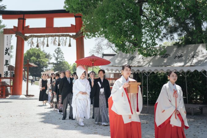 新緑の中、皆様なごやかに参進され、本殿御前での神前式では少し緊張されたご様子も見られましたが、新郎様も立派に誓詞を読み上げられ、おふたりの契りをしっかりとご奉告されました。