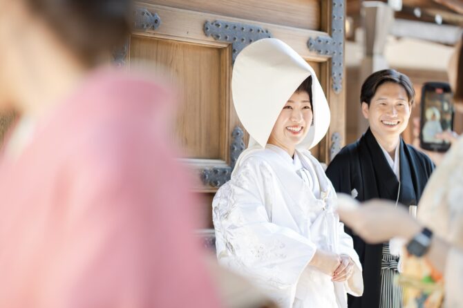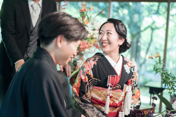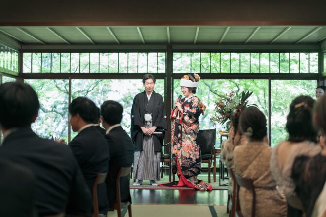 十牛庵では、引振袖にかつら+角隠しのスタイルでご入場。中座後は洋髪へとチェンジされ、どちらの装いも新婦様の美しさが一層引き立ち、ゲストの皆様も癒やされたのではないでしょうか。
